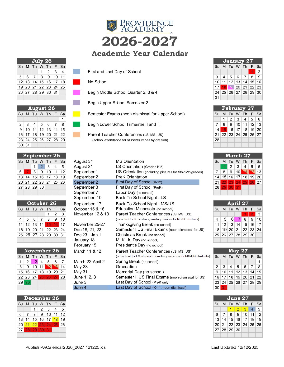 Providence Academy Academic Calendar Download a PDF of the 2025-26 Academic Calendar Download a PDF of the 2026-27 Academic Calendar Download a PDF of the 2024-25 Academic Calendar Download a PDF of the 2025-26 Academic Calendar