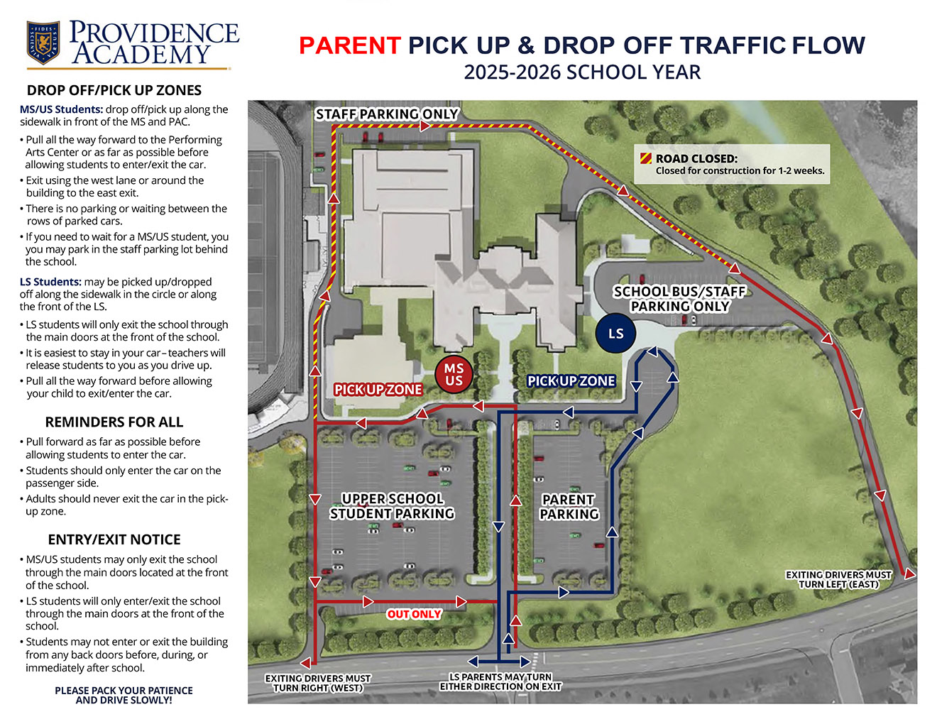 *One Important Note* – the ring road that encircles the school will be closed due to construction traffic for several weeks. This temporarily limits your ability to exit campus by driving around the ring road, through the back (North) parking lot and out our far East drive. However, once this construction concludes, utilizing this drive will prove helpful to you in exiting campus at pickup time each afternoon.